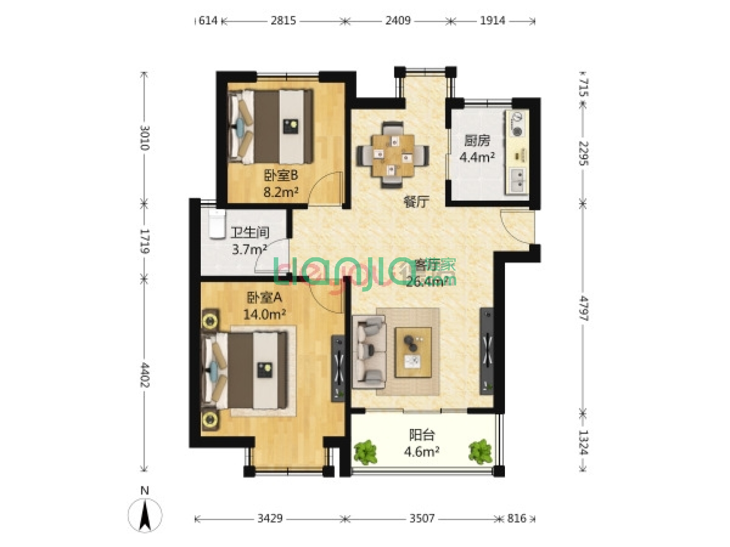 庭院深深,2室2厅2卫 90㎡